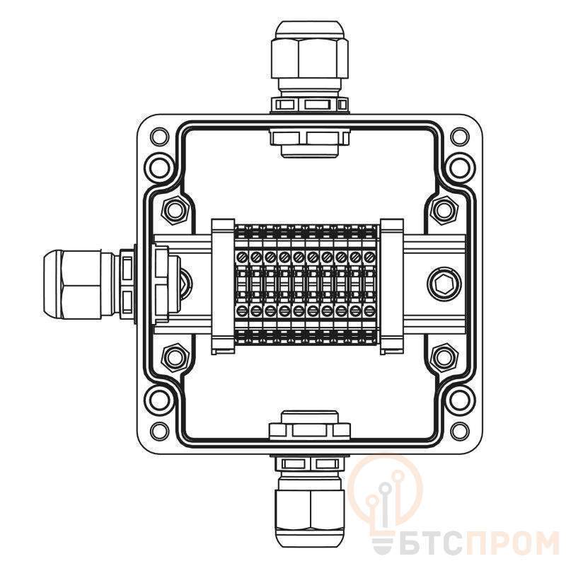 Взрывозащищенная клеммная коробка из полиэстера TBE-P-03-(10хCBC.2)-1хPABMP(A)-1хPABMP(C)-1хPABMP(D)1Eх e IIC Т5 Gb / Eх tb IIIC T95°C Db IP66 Un=500 В, In=24 А Взрывозащищенная клеммная коробка GRP 120х120х90мм 1Eх e IIC Т5 Gb / Eх tb IIIC T95°C Db IP66 Температурный режим Т5 40°C Количество клемм: CBC.2 10 шт. Ток А Вводы Сторона А: Взрывозащищенный полиамидный кабельный ввод, небронированный кабель M20х1,5 D7-12мм. IP66/68 1 шт. Сторона C: Взрывозащищенный полиамидный кабельный ввод, небронированный кабель M20х1,5 D7-12мм. IP66/68 1 шт. Сторона D: Взрывозащищенный полиамидный кабельный ввод, небронированный кабель M20х1,5 D7-12мм. IP66/68 1 шт.