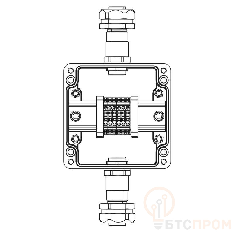 Взрывозащищенная клеммная коробка из полиэстера TBE-P-03-(6xCBC.2)-1xKAEPM2MHK-20(A)-1xKAEPM2MHK-20(C)1Ex e IIC Т5 Gb / Ex tb IIIC T95°C Db IP66/КЗ Un=500 В, In=24 А Взрывозащищенная клеммная коробка GRP 120x120x90мм 1Ex e IIC Т5 Gb / Ex tb IIIC T95°C Db IP66 Температурный режим Т5 40°C Кольца заземления Количество клемм: CBC.2 6 шт. Ток А Вводы Сторона А: Универсальный кабельный ввод серии КАЕРМ для бронированного и небронированного кабеля М20х1,5 d:5,8-12мм. Dn:20. Никелированная латунь IP66/IP68 1 шт. Сторона C: Универсальный кабельный ввод серии КАЕРМ для бронированного и небронированного кабеля М20х1,5 d:5,8-12мм. Dn:20. Никелированная латунь IP66/IP68 1 шт.
