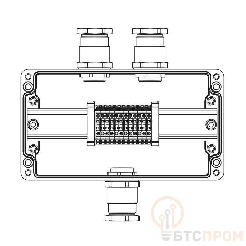 Взрывозащищенная клеммная коробка из полиэстера TBE-P-04-(12хCBC.2)-2хKH3MHK(A)-1хKH3MHK(C)1Eх e IIC Т5 Gb / Eх tb IIIC T95°C Db IP66/КЗ Un=500 В, In=24 А Взрывозащищенная клеммная коробка GRP 220х120х90мм 1Eх e IIC Т5 Gb / Eх tb IIIC T95°C Db IP66 Температурный режим Т5 40°C Кольца заземления Количество клемм: CBC.2 12 шт. Ток А Вводы Сторона А: Взрывозащищенный кабельный ввод серии КН для небронированного кабеляМ25х1,5 D:11,8-18мм. Никелированная латунь IP66/IP68 2 шт. Сторона C: Взрывозащищенный кабельный ввод серии КН для небронированного кабеляМ25х1,5 D:11,8-18мм. Никелированная латунь IP66/IP68 1 шт.