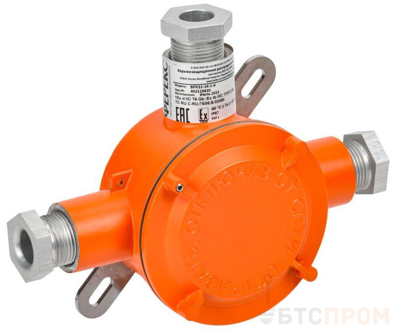 Взрывозащищенные распределительные коробки ВРК предназначены для защиты соединений и разветвлений гибких кабелей в электрических цепях, на объектах в различных отраслях промышленности с высоким риском взрыва и пожара, в зонах опасных по воспламенению горючих газовоздушных смесей или пыли. Коробки поставляются с кабельными вводами и комплектами для кабелей диаметром от 6,0 до 16 мм. Маркировка взрывозащиты по газу: 1Ex Db IIC T6 Gb. Маркировка взрывозащиты по пыли: Ex Tb IIIC T75 C Db.