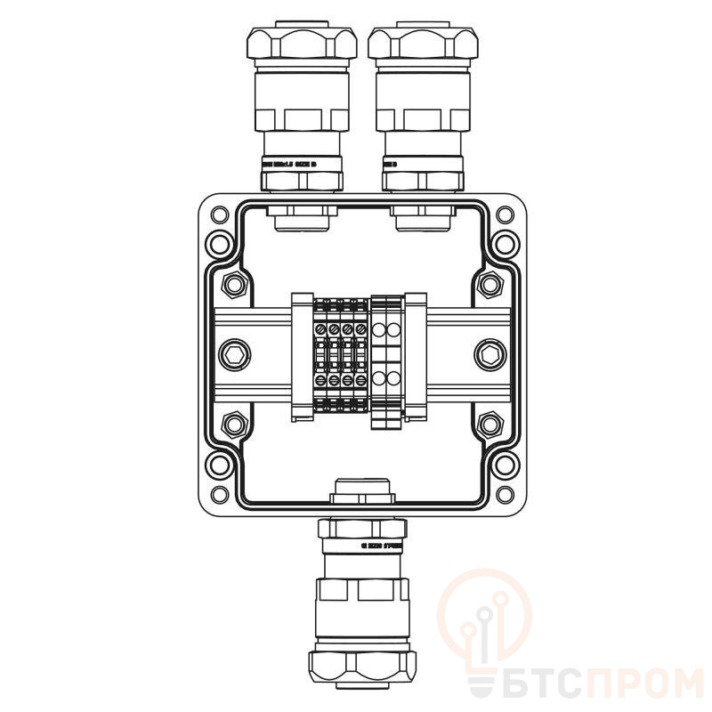 TBE-P-03-(2xCBC.2-2xCBC.2(i)-2xTEO.2)-2x6018ANP22BKM2SB(A)-1x6018ANP22BKM2SB(C)1Ex e IIC Т5 Gb / Ex tb IIIC T95°C Db IP66 Un=500 В, In=24 А Взрывозащищенная клеммная коробка GRP 120x120x90мм 1Ex e IIC Т5 Gb / Ex tb IIIC T95°C Db IP66 Температурный режим Т5 40°C Количество клемм: CBC.2 2 шт. Ток А CBC.2(i) 2 шт. Ток А TEO.2 2 шт. Ток А Вводы Сторона А: Взрывозащищенный кабельный ввод ANP под небронированный кабель в металлорукаве M20х1,5 D8-13мм, Dn20мм. Никелированная латунь.IP66/68 2шт. Сторона C: Взрывозащищенный кабельный ввод ANP под небронированный кабель в металлорукаве M20х1,5 D8-13мм, Dn20мм. Никелированная латунь.IP66/68 1шт.