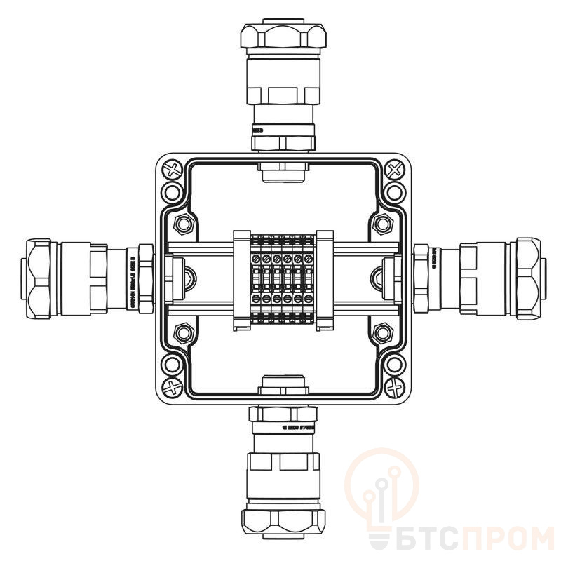TBE-P-03-(6xCBC.2)-1x6018ANP22BKM2SB(A)-1x6018ANP22BKM2SB(B)-1x6018ANP22BKM2SB(C)-1x6018ANP22BKM2SB(D)1Ex e IIC Т5 Gb / Ex tb IIIC T95°C Db IP66/КЗ Un=500 В, In=24 А Взрывозащищенная клеммная коробка GRP 120x120x90мм 1Ex e IIC Т5 Gb / Ex tb IIIC T95°C Db IP66 Температурный режим Т5 40°C Кольца заземления Количество клемм: CBC.2 6 шт. Ток А Вводы Сторона А: Взрывозащищенный кабельный ввод ANP под небронированный кабель в металлорукаве M20х1,5 D8-13мм, Dn20мм. Никелированная латунь.IP66/68 1шт. Сторона B: Взрывозащищенный кабельный ввод ANP под небронированный кабель в металлорукаве M20х1,5 D8-13мм, Dn20мм. Никелированная латунь.IP66/68 1шт. Сторона C: Взрывозащищенный кабельный ввод ANP под небронированный кабель в металлорукаве M20х1,5 D8-13мм, Dn20мм. Никелированная латунь.IP66/68 1шт. Сторона D: Взрывозащищенный кабельный ввод ANP под небронированный кабель в металлорукаве M20х1,5 D8-13мм, Dn20мм. Никелированная латунь.IP66/68 1шт.