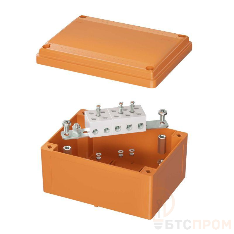 Предназначение огнестойких ответвительных коробок – соединение и ответвление проводов и кабелей с сохранением работоспособности при пожаре. Коробки применяются в составе огнестойких кабельных линий и прошли испытания в соответствии с ГОСТ Р 53316 с продукцией различных кабельных заводов. Материал – специальный термопласт, цвет – оранжевый, RAL2003. В комплект поставки коробок входят керамические клеммники, а также огнестойкие метизы (монтажная пластина, анкера, винты, шайбы, гайки).