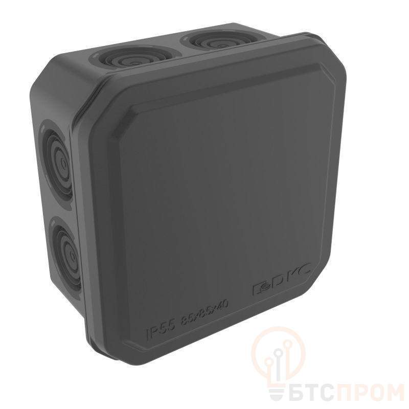 Применяется для защиты и эстетичного оформления мест соединения кабелей (информационных, осветительных, силовых). Коробка имеет 8 герметичных вводов по периметру для ввода жестких и гофрированных труб, а также кабелей с максимальным диаметром 20 мм, и 2 дополнительных ввода на торцевой части коробки для ввода жестких и гофрированных труб, а также кабелей диаметром 20 мм. Параметры 85x85х40 мм (внутренние размеры) и 94х94х48 мм (внешние размеры). Квадратная форма. Материал – пластик. Крышка - матовая, непрозрачная, закрывается защелкиванием. IP55 по ГОСТ 14254. Можно устанавливать как в помещении, так и на открытом воздухе (при условии защиты от воздействия прямых солнечных лучей и осадков). Цвет - черный. Температура эксплуатации от –25 до +60 °С. Halogen free.