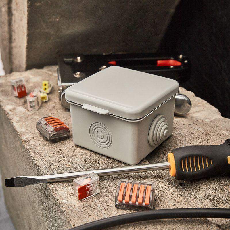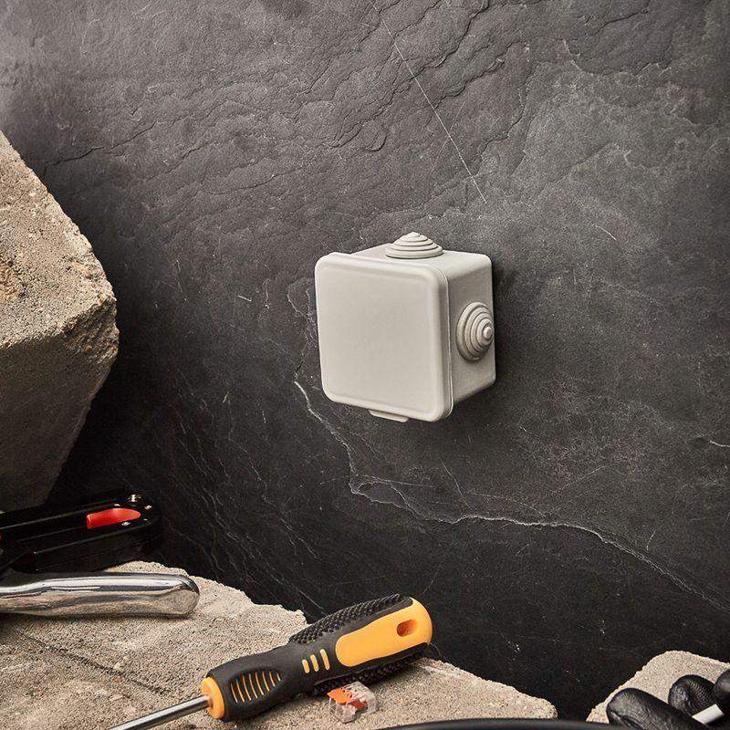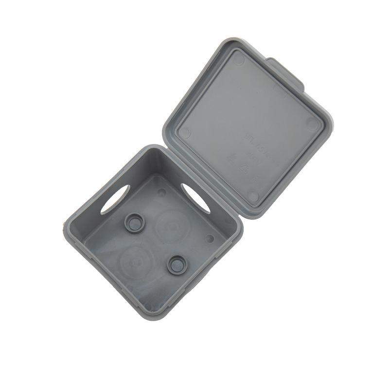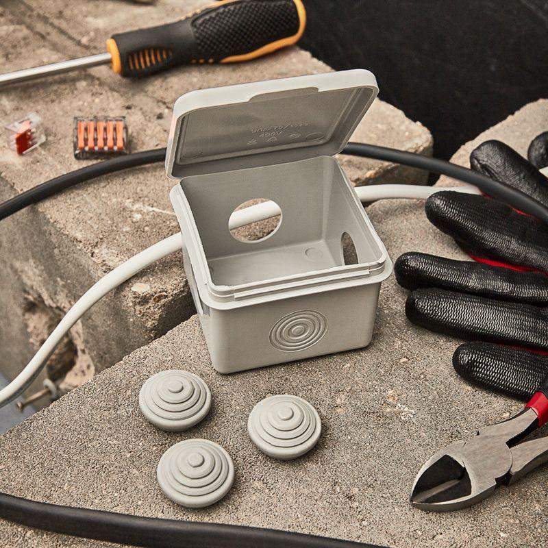 Распаячная коробка предназначена для защиты кабельных соединений от пыли влаги и механических повреждений. Предназначена для крепления на стены, потолки, лотки. Укомплектована вводными сальниками. Размер: 65х65х50 мм Степень защиты: IP54 Цвет: Серый Количество вводов: 4 Материал: Полипропилен