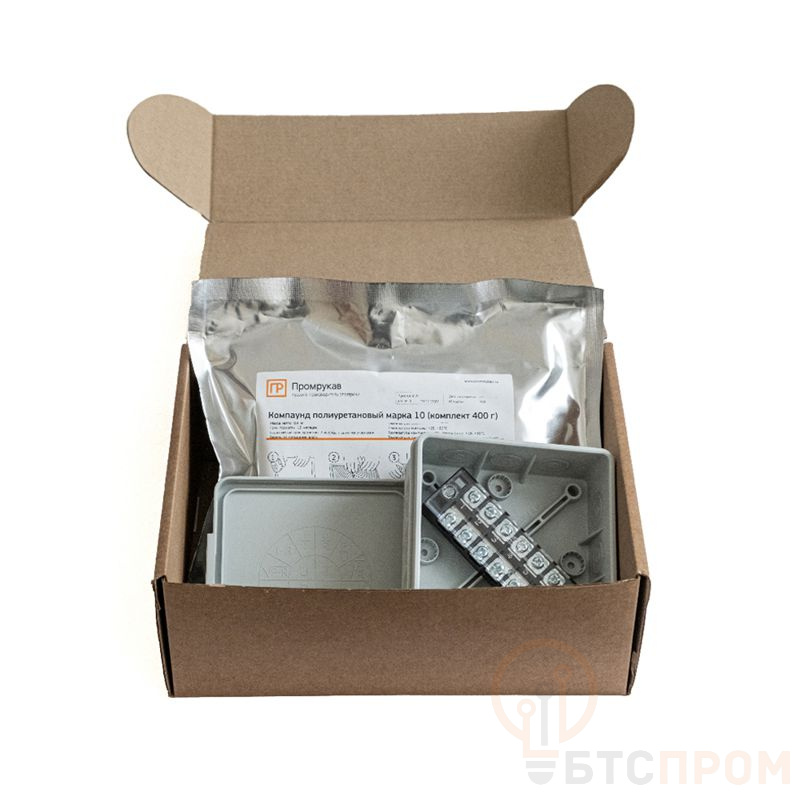 Коробки распределительные с компаундом и клеммными зажимами применяются для защиты мест соединения проводов и кабелей от механических повреждений, от проникновения пыли и влаги.Клеммный терминал, фиксируемый в распределительной коробке, предназначен для присоединения и ответвления медных и алюминиевых проводников в электрических цепях переменного тока напряжением до 660 В частотой 50 Гц. Номинальный ток 25А. Двухкомпонентный полиуретановый компаунд предназначен для герметизации, электроизоляции и механической защиты кабельных соединений в распределительно коробки. (В комплектацию входит: коробка распределительная 1 шт., клеммный терминал 1 шт., саморезы оцинкованные (3*12) 2 шт., полиуретановый компаунд 1 пакет)