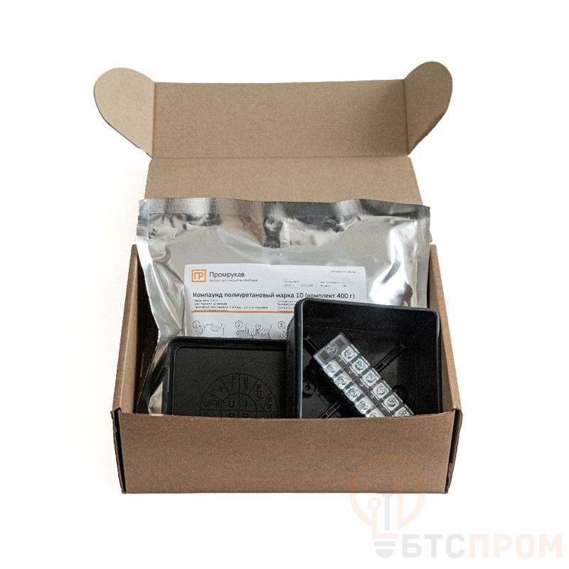 Коробка распределительная 100х100х50 (HF) двухкомп. в комплекте с компаундом и с 6-кл. зажимами 2.5мм черн. Промрукав PR80.0179