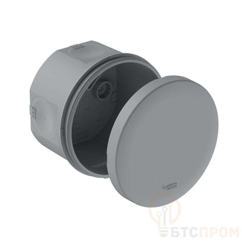 Коробка распределительная IP66. Внутренний размер - O80x50. Цвет - серый. Выполнена по технологии двухкомпонентного литья. Для ввода кабелей и труб имеет на боковых сторонах 4 мембраны O20 мм, которые надежно обхватывают кабель/трубу. Еще один ввод имеется на дне коробки. Коробка предназначена для монтажа пристреливанием, например, при помощи газового пистолета. Крепежные отверстия имеют колодцы под ствол O11 мм. Огнестойкость-650°С. На дно наклеена этикетка c информацией для розничной продажи.