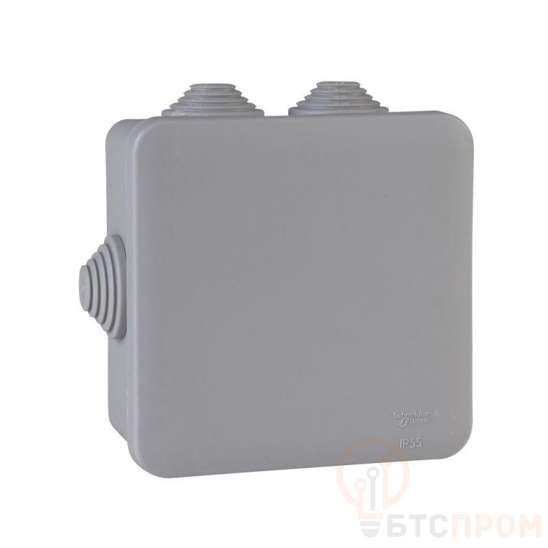 Распределительные коробки Systeme Electric (ранее Schneider Electric) используются для открытой установки. Имеют защёлкивающуюся крышку, колпачки, изолирующие крепёжные винты, и 6 ступенчатых сальников для ввода кабеля или гофротрубы. Сальники подходят для кабелей и труб диаметром 4…8, 8…12, 12…16, 16…20 и 25 мм. Размеры: внутренние 100x100x50, внешние 130х130х58 мм. Степень защиты – IP55, огнестойкость – 750 °С. Материал: полипропилен. Цвет - серый.