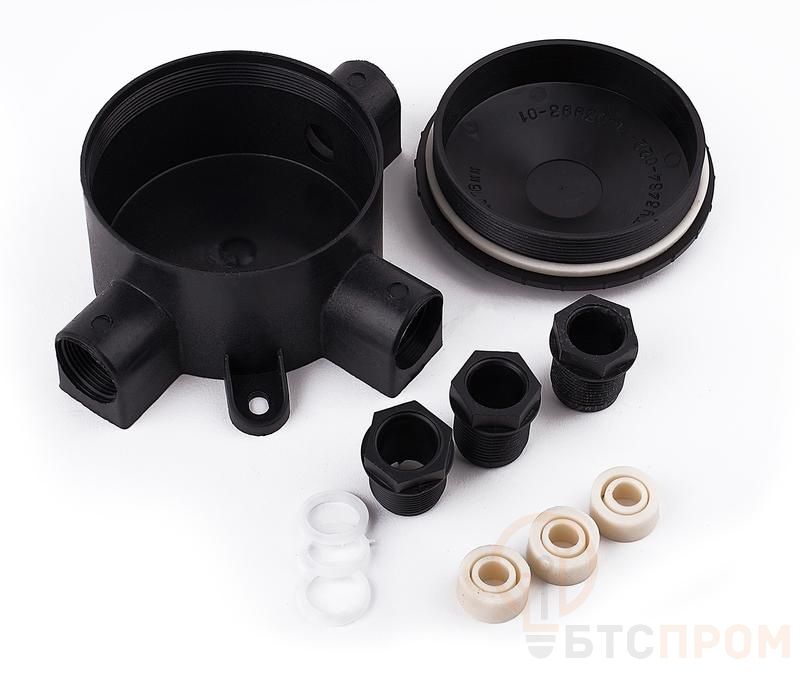 Предназначена для осуществления ответвлений и соединений кабелей круглого сечения наружным диаметром до 16 мм, а также двужильных кабелей плоской формы, прокладываемых открыто в осветительных сетях пожароопасных зон. Коробка состоит из корпуса и крышки, соединяемых на резьбе. Корпус имеет 3 сальниковых ответвления с внутренней резьбой, в которые ввёртываются пластмассовые гайки. Для уплотнения под крышкой и в сальниковых ответвлениях проложены мягкие уплотнительные кольца. Изготавливается из стеклонаполненной, трудно горючей пластмассы. Климатическое исполнение: У1;5 ГОСТ15150 ТУ 3464-022-01403993-01