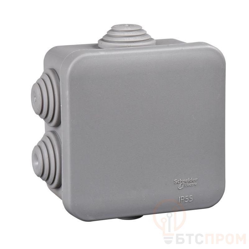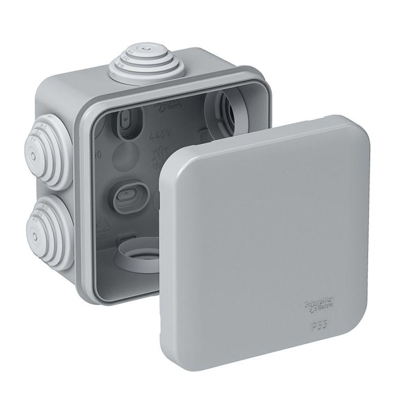 Распределительные коробки Systeme Electric (ранее Schneider Electric) используются для открытой установки. Имеют защёлкивающуюся крышку, колпачки, изолирующие крепёжные винты, и 6 ступенчатых сальников для ввода кабеля или гофротрубы. Сальники подходят для кабелей и труб диаметром 4…8, 8…12, 12…16 и 20 мм. Размеры: внутренние 70x70x40, внешние 95х95х48 мм. Степень защиты – IP55, огнестойкость – 750 °С. Материал: полипропилен. Цвет - серый.