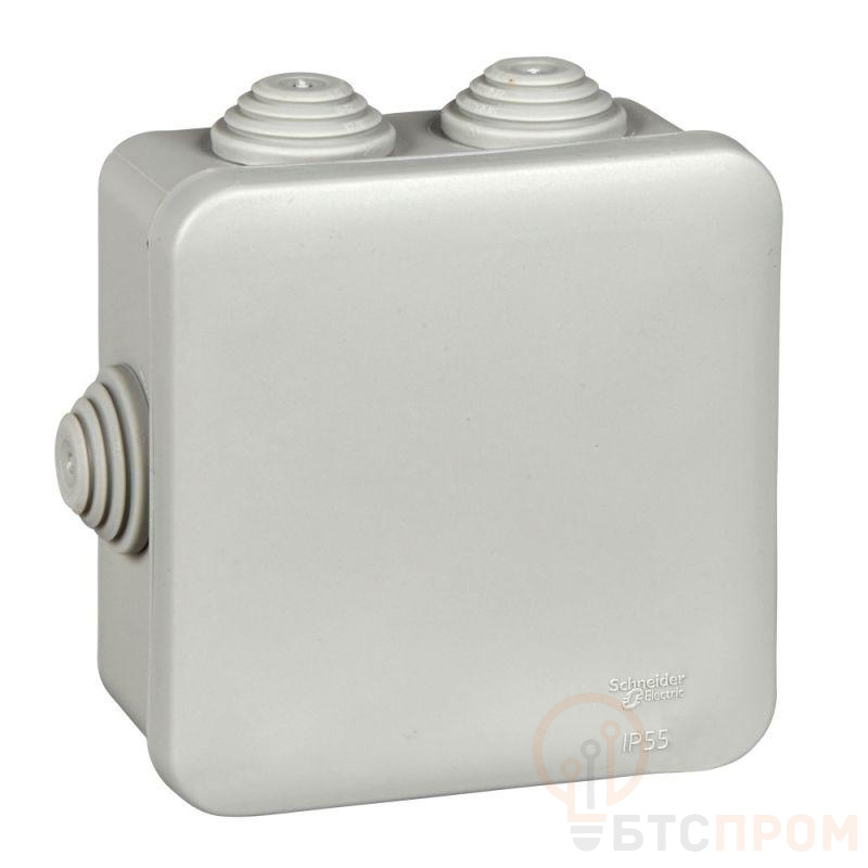 Распределительные коробки Systeme Electric (ранее Schneider Electric) используются для открытой установки. Имеют защёлкивающуюся крышку, колпачки, изолирующие крепёжные винты, и 6 ступенчатых сальников для ввода кабеля или гофротрубы. Сальники подходят для кабелей и труб диаметром 4…8, 8…12, 12…16 и 20 мм. Размеры: внутренние 85x85x40, внешние 110х110х48 мм. Степень защиты – IP55, огнестойкость – 750 °С. Материал: полипропилен. Цвет - серый.