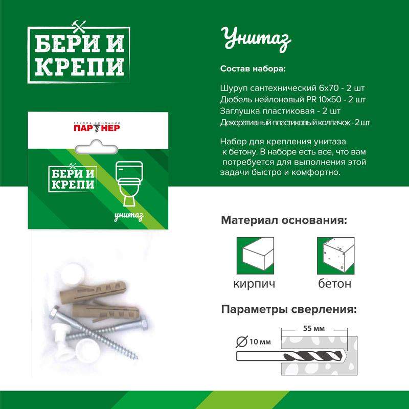 Набор для крепления унитаза к бетону. В наборе есть все, что вам потребуется для выполнения этой задачи быстро и комфортно. КОМПЛЕКТАЦИЯ Шуруп сантехнический 6х70 - 2 шт Дюбель нейлоновый PR 10x50 - 2 шт Заглушка пластиковая - 2 шт Декоративный пластиковый колпачок - 2 шт