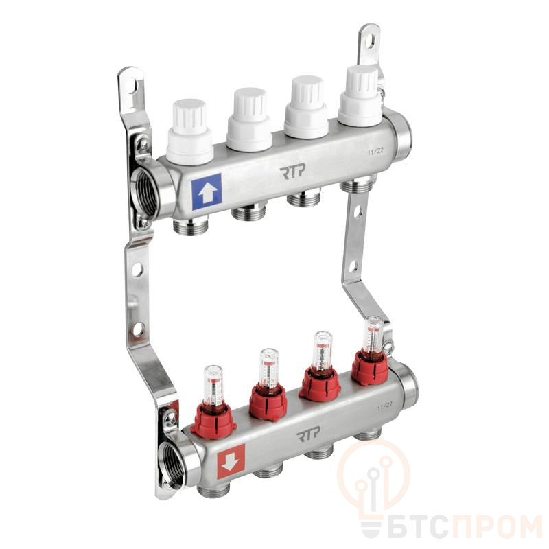 Ключевой особенностью данной модели является наличие встроенных расходомеров на каждом отводе. Это позволяет визуально контролировать и точно балансировать расход жидкости по отдельным контурам, обеспечивая равномерный прогрев и оптимизацию работы системы. Для удобства и долговечности монтажа группа укомплектована кронштейном из нержавеющей стали марки SUS 304, который обладает высокой коррозионной стойкостью.