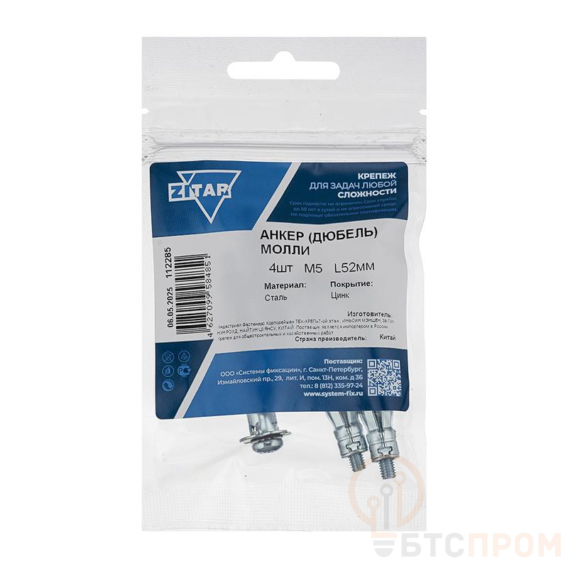 Дюбель-анкер Molly M5x52 от бренда Tech-Krep/Zitar — это надежное решение для крепления различных предметов к пустотелым конструкциям. Изделие изготовлено из высококачественной оцинкованной стали, что обеспечивает устойчивость к коррозии и длительный срок службы.