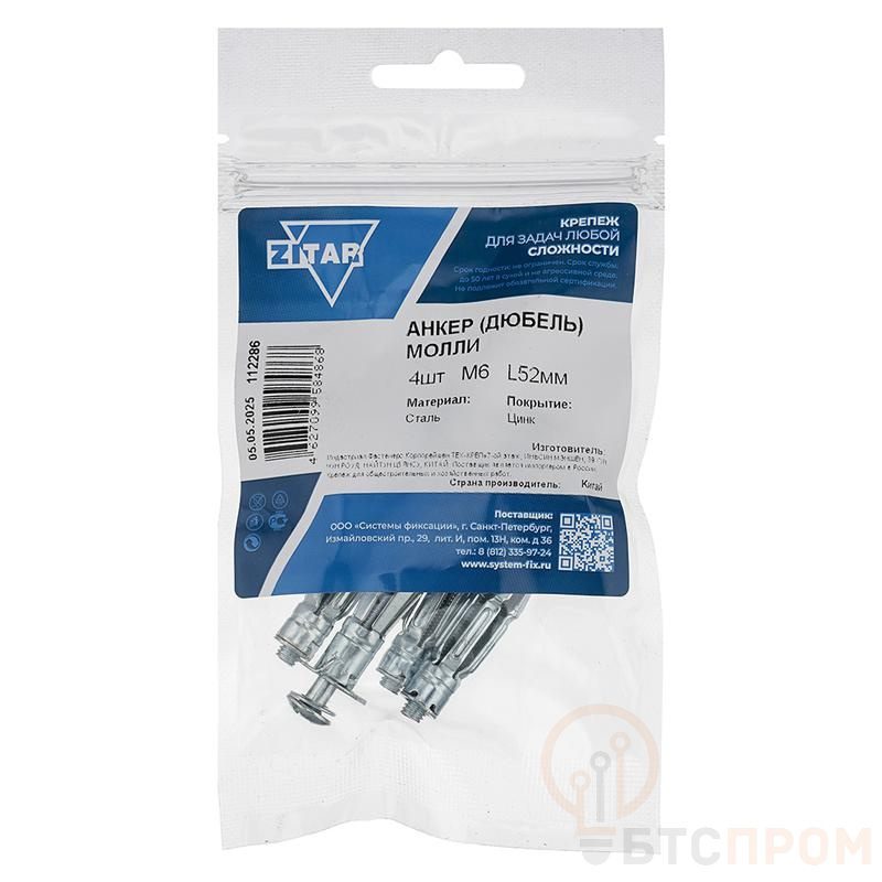 Дюбель-анкер Molly M6x52 от бренда Tech-Krep/Zitar — это надежное решение для крепления тяжелых предметов к пустотелым конструкциям. Изделие изготовлено из высококачественной оцинкованной стали, что обеспечивает коррозионную стойкость и долговечность.