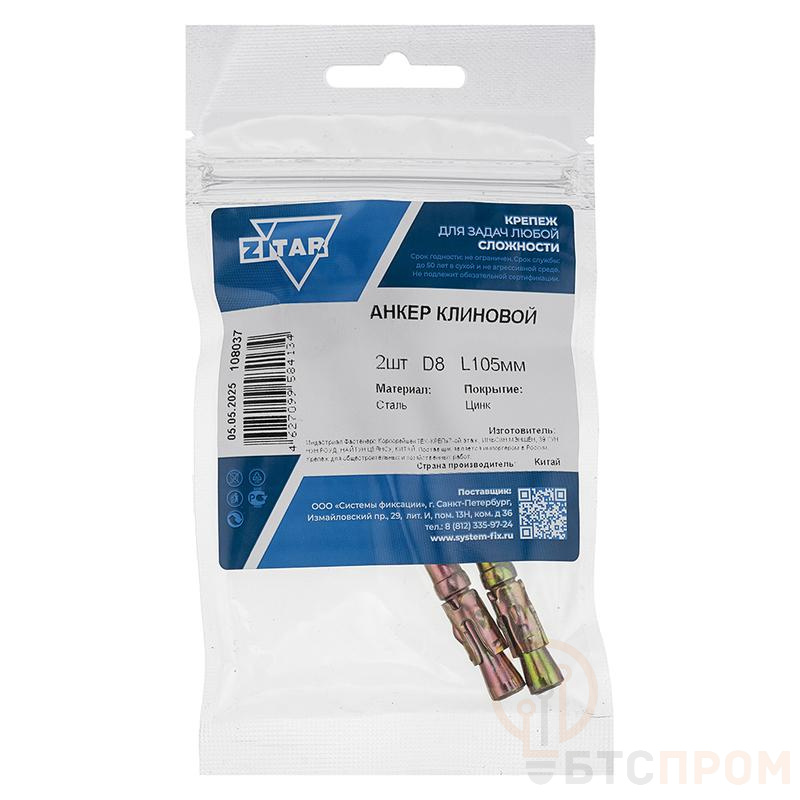 Анкер клиновой 8х105 мм от бренда Tech-Krep/Zitar — это надежный и долговечный крепежный элемент, предназначенный для монтажа тяжеловесных конструкций к полнотелому бетону и природному камню. Изделие изготовлено из высокопрочной оцинкованной стали, что обеспечивает превосходную коррозионную стойкость и длительный срок службы даже в условиях повышенной влажности.