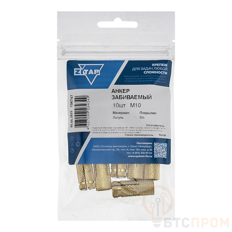 Ключевые характеристики: диаметр резьбы М10, материал — прочная латунь, тип — забивной. Поставляется в удобной упаковке по 10 штук от производителя Tech-Krep/Zitar (арт. 106747).