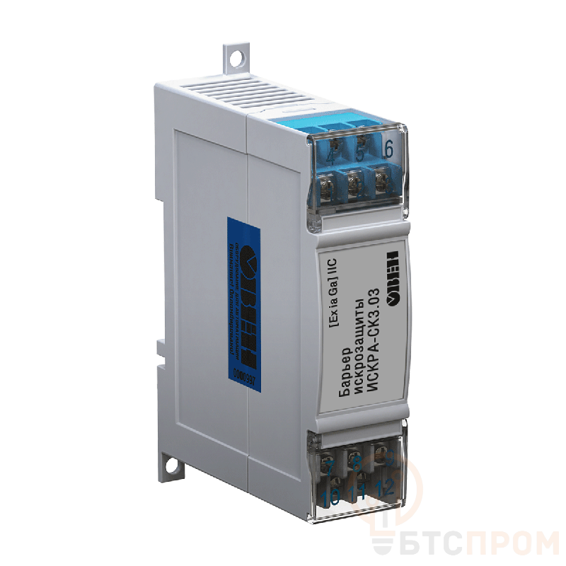 Барьер искрозащиты ИСКРА-СК3.03 ОВЕН (97474) — это надежное устройство, предназначенное для защиты взрывоопасных зон. Он обеспечивает безопасную передачу сигналов и питания к оборудованию, установленному в таких зонах, предотвращая возможность воспламенения за счет ограничения энергии.