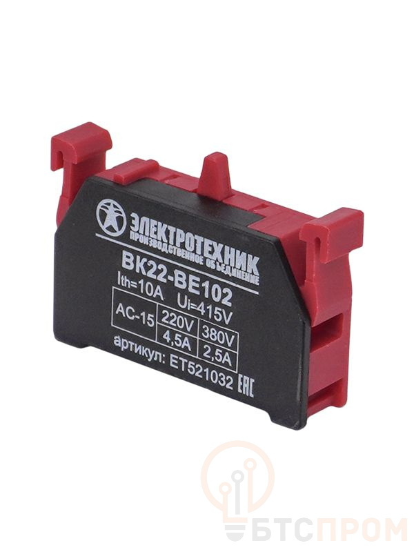 <p>Блок-контакт ВК22-BE102 1НЗ красный от производителя Электротехник (артикул ET521032) — это надежный и долговечный аппарат коммутации и управления. Устройство обладает катушкой управления на переменное напряжение 110 В и имеет одну пару нормально замкнутых (размыкающих) контактов. Яркий красный цвет корпуса способствует быстрой идентификации состояния и позиции аппарата в щите.</p>