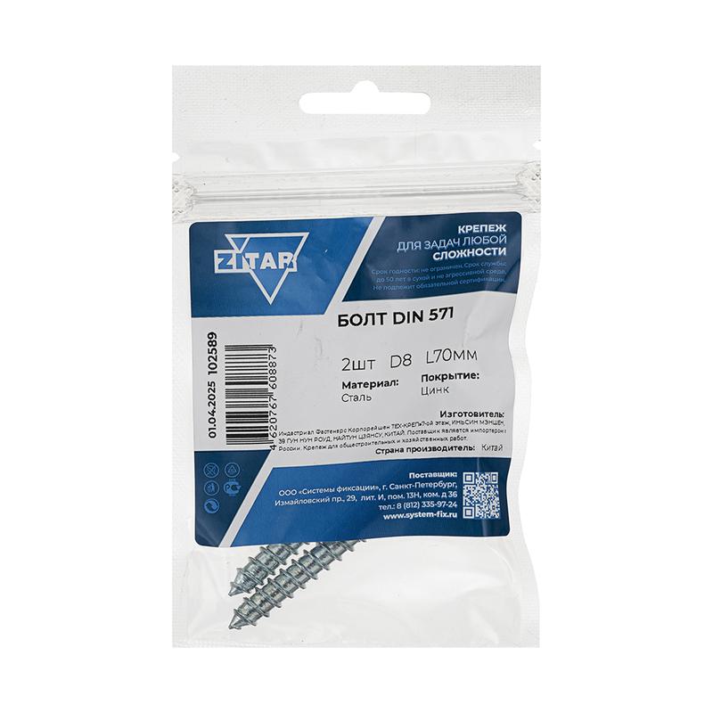 Болт сантехнический 8х70 DIN 571 оцинк. (уп.2шт) Tech-Krep/Zitar 102589 фото в каталоге от BTSprom.by