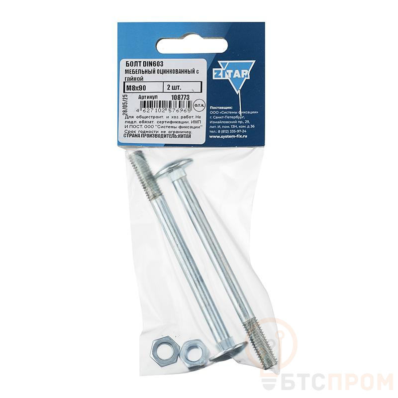 Болт мебельный с гайкой М8х90 DIN 603 от бренда Tech-Krep/Zitar – это надежный крепежный элемент для сборки и ремонта мебели. Изделие имеет стандарт DIN 603, что гарантирует точность размеров и резьбы. Резьба метрическая М8, общая длина болта составляет 90 мм. Для защиты от коррозии болт и гайка оцинкованы, что обеспечивает долговечность даже в условиях переменной влажности.