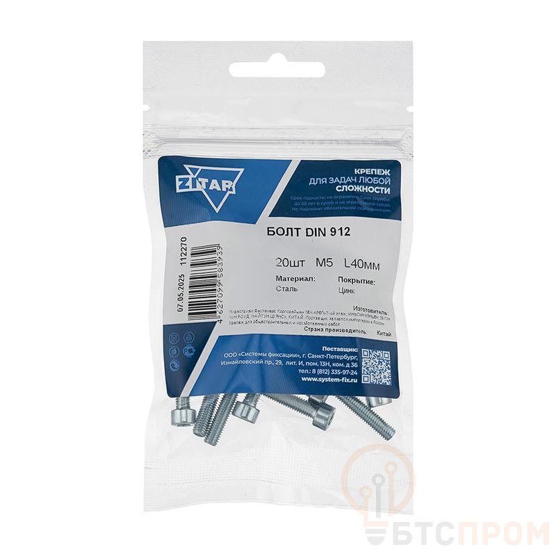 Болт с цилиндрической головкой и внутр. шестигранником 5х40 DIN 912 (уп.20шт) Tech-Krep/Zitar 112270