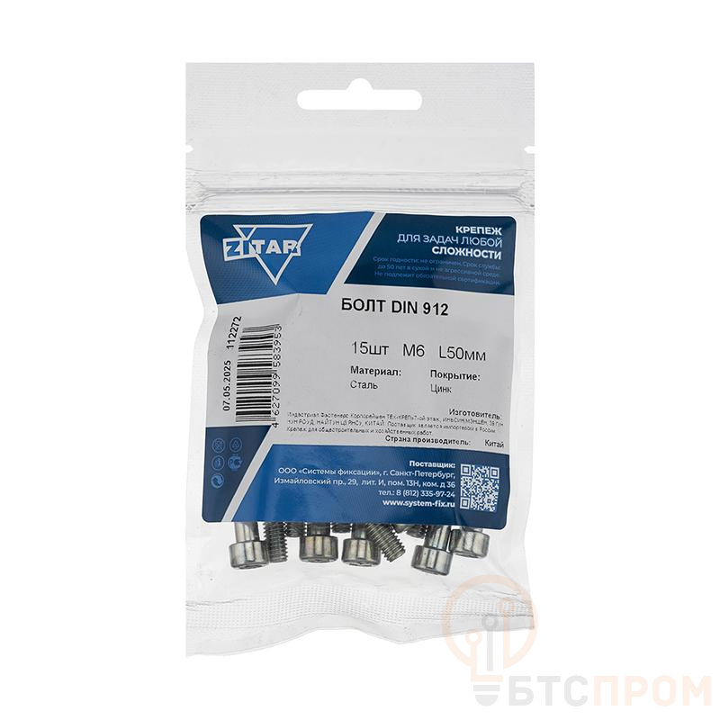 Болт с цилиндрической головкой и внутр. шестигранником 6х50 DIN 912 (уп.15шт) Tech-Krep/Zitar 112272