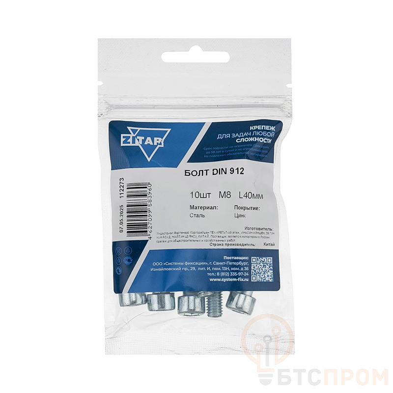 Болт с цилиндрической головкой и внутр. шестигранником 8х40 DIN 912 (уп.10шт) Tech-Krep/Zitar 112273