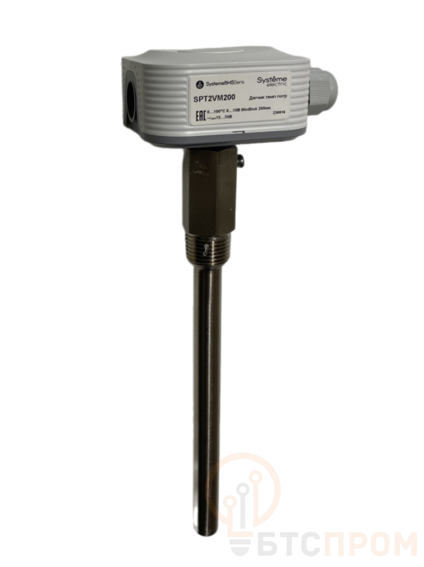 Датчик температуры погружной, диапазон измерения температуры 0…+100°С, выходной сигнал 0…10В, RS485/Modbus 200мм напряжение питания 24 В переменного тока±20%/=15…35В, в комплект поставки входит гильза 150 мм