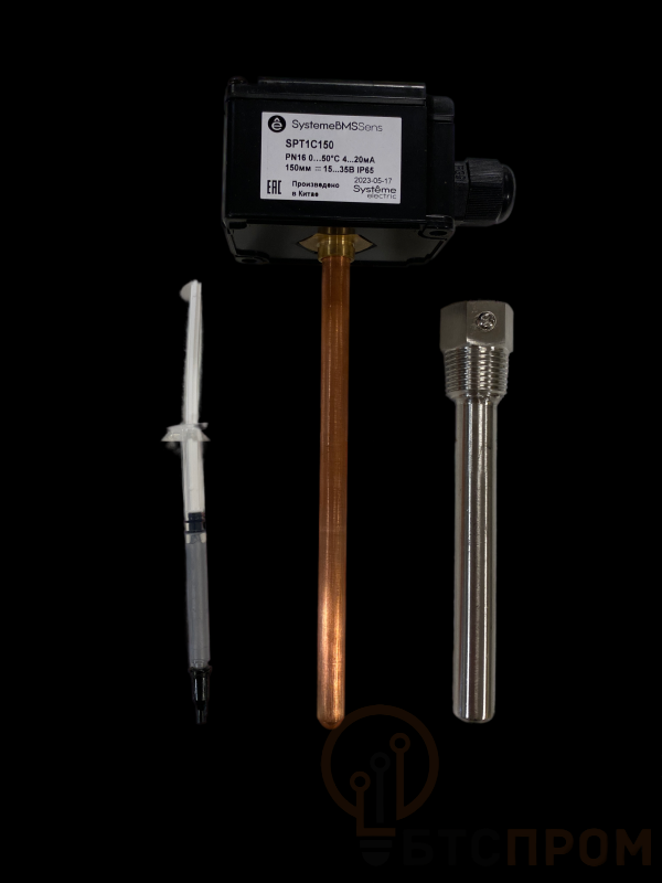 Датчик температуры погружной, диапазон измерения температуры 0…+50°С, выходной сигнал 4…20 мА, длина погружной части 150 мм, напряжение питания 15…35 В постоянного тока, в комплект поставки входит гильза 100 мм