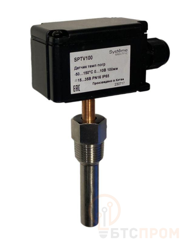 Датчик температуры погружной, диапазон измерения температуры -50…+150°С, выходной сигнал 0…10В, длина погружной части 100 мм, напряжение питания 15…35 В постоянного тока, в комплект поставки входит гильза 50 мм