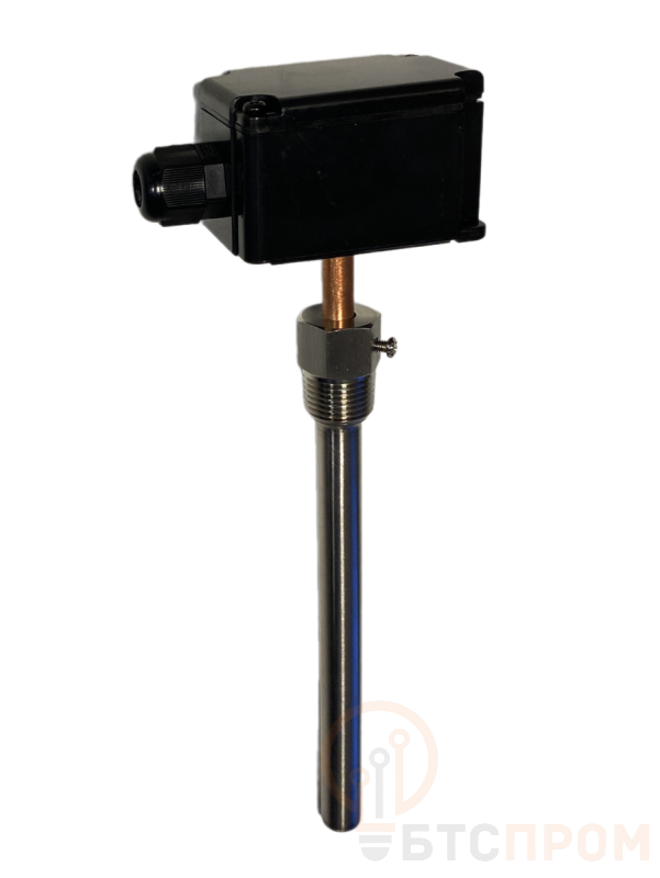 Датчик температуры погружной, диапазон измерения температуры -50…+150°С, выходной сигнал 4…20 мА, длина погружной части 200 мм, напряжение питания 15…35 В постоянного тока, в комплект поставки входит гильза 150 мм
