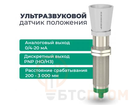 Ультразвуковой датчик с аналоговым выходом ДПУ-М30-100У-3110-СА в цилиндрическом корпусе из никелированной латуни D=30 мм, в общепромышленном исполнении. Предназначен для контроля уровня жидких и сыпучих веществ, контроля положения, позиционирования и обнаружения прозрачных объектов, объектов разных форм и цветов. Область применения Ультразвуковые датчики с аналоговым выходом находят широкое применение в автоматизации производственных процессов на предприятиях химической, машиностроительной, металлургической, пищевой и других отраслях промышленности. Датчик серии ДПУ-М30 гарантирует стабильное обнаружение с высокой точностью в тяжелых условиях тумана, запыленности, задымленности и т.п. Ключевые характеристики Аналоговый выход 0/4 мА-20 мА Выходной сигнал дискретный PNP-НО/НЗ (программируемый) Зона чувствительности 200-3000 мм Рабочее напряжение 10-30 В DC. Отличительные особенности Пылевлагонепроницаемость IP65 Виброустойчивость (заливка компаундом) до 50g Способен работать в широком диапазоне температур от -30...+70 C Способ подключения кабель.