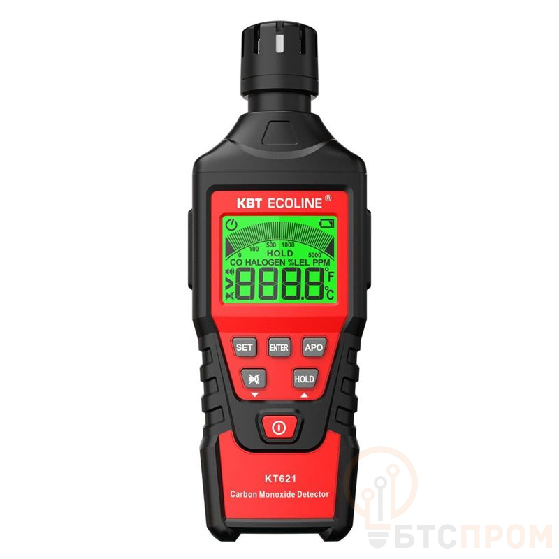 Детектор угарного газа КТ 621 ECOLINE от КВТ — надежный бытовой газоанализатор для непрерывного контроля уровня опасного CO в воздухе. Прибор оснащен цифровым дисплеем, отображающим текущую концентрацию газа в ppm, и светодиодной индикацией состояния (норма, тревога, неисправность).