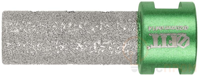 Профи. Пальчиковая, хвостовик М14. Для сухого и влажного расширения отверстий, обработки краев отверстий и граней керамогранита, гранита, мрамора, камня, керамической плитки, бетона и кирпича. Технология вакуумного спекания обеспечивает фрезе большую твердость и более длительный срок службы. Отверстия в рабочей части для отвода пыли. Материал: инструментальная сталь, рабочая кромка содержит порошок из технических алмазов. Упаковка: блистер.