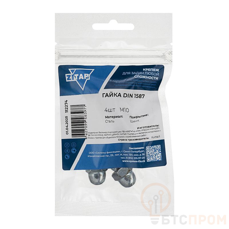 Гайка колпачковая М10 DIN 1587 оцинк. (уп.4шт) Tech-Krep/Zitar 112274 фото в каталоге от BTSprom.by