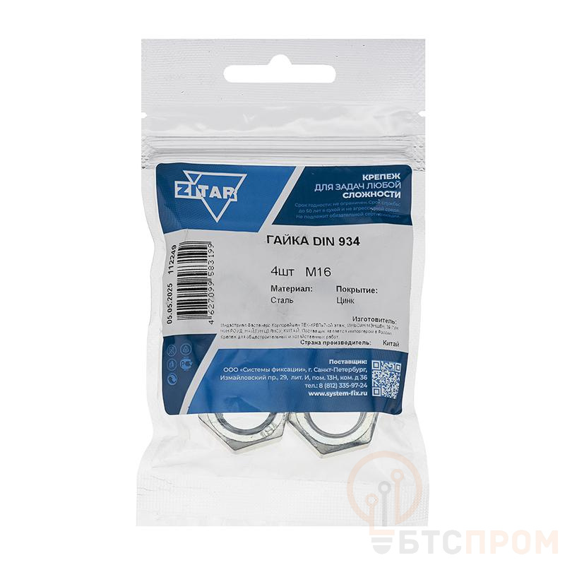 Гайка шестигранная М16 DIN 934 оцинк. (уп.4шт) Tech-Krep/Zitar 112249 фото в каталоге от BTSprom.by