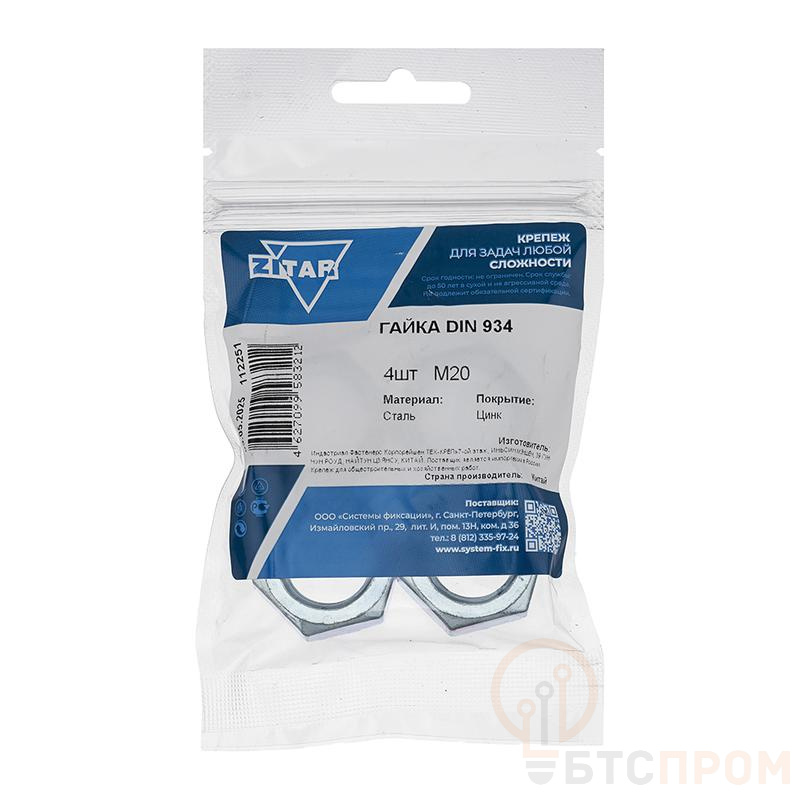 Гайка шестигранная М20 DIN 934 оцинк. (уп.4шт) Tech-Krep/Zitar 112251 фото в каталоге от BTSprom.by