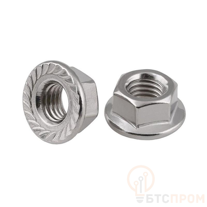 Область применения: применяется для надежного скрепления узлов и элементов конструкций совместно с метрическими крепежами в машиностроении, автомобилестроении, приборостроении и других отраслях. Материал: углеродистая сталь с антикоррозионным цинковым покрытием. Особенности: имеет шестигранную головку, плоский фланец с насечками и метрическую резьбу. Фланец позволяет плотно фиксировать плоскую поверхность, а насечки на фланце предотвращают самопроизвольное откручивание гайки.
