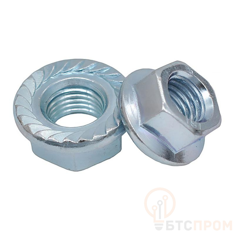 Область применения: применяется для надежного скрепления узлов и элементов конструкций совместно с метрическими крепежами в машиностроении, автомобилестроении, приборостроении и других отраслях. Материал: углеродистая сталь с антикоррозионным цинковым покрытием. Особенности: имеет шестигранную головку, плоский фланец с насечками и метрическую резьбу. Фланец позволяет плотно фиксировать плоскую поверхность, а насечки на фланце предотвращают самопроизвольное откручивание гайки.