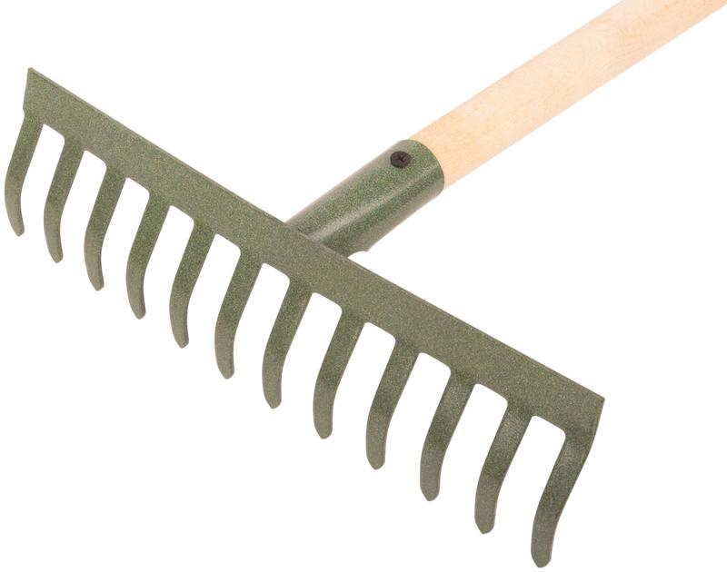 Грабли с деревянным черенком, прямой зуб. Материал: инструментальная сталь, дерево.