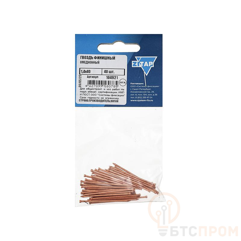 Гвоздь финишный 1.4х40 мм с омедненным покрытием от бренда Tech-Krep/Zitar — это крепежный элемент, предназначенный для ответственных столярных и отделочных работ. Тонкий диаметр 1.4 мм и небольшая шляпка позволяют добиться минимальной видимости крепления, утапливая ее в материал с помощью добойника.