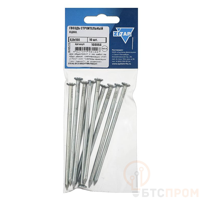 Гвоздь строительный 4.0х100 мм оцинкованный от бренда Tech-Krep/Zitar — это надежный и долговечный крепеж для ответственных строительных и хозяйственных задач. Изделие изготовлено из качественной стали и покрыто защитным слоем цинка, что эффективно предотвращает появление коррозии и обеспечивает устойчивость к воздействию влаги.