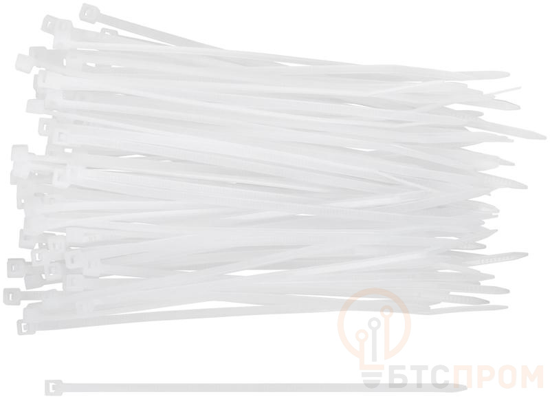 Белые. 100 шт. Предназначены для соединения и фиксации проводов, кабелей, труб и других конструкций. Монтаж может осуществляться как вручную, так и с использованием специального пистолета. Замок имеет ступенчатую фиксацию с блокировкой обратного хода. Материал: нейлон. Упаковка: п/э пакет с подвесом.