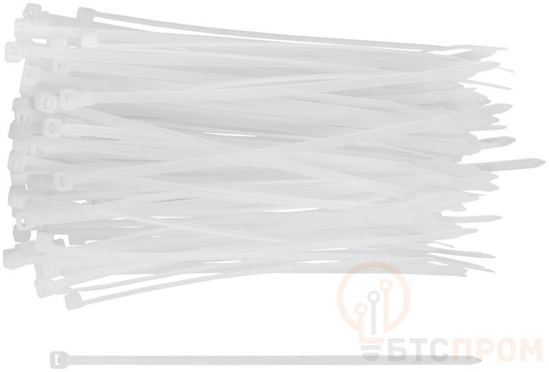 Белые. 100 шт. Предназначены для соединения и фиксации проводов, кабелей, труб и других конструкций. Монтаж может осуществляться как вручную, так и с использованием специального пистолета. Замок имеет ступенчатую фиксацию с блокировкой обратного хода. Материал: нейлон. Упаковка: п/э пакет с подвесом.