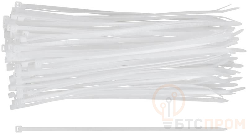 Белые. 100 шт. Предназначены для соединения и фиксации проводов, кабелей, труб и других конструкций. Монтаж может осуществляться как вручную, так и с использованием специального пистолета. Замок имеет ступенчатую фиксацию с блокировкой обратного хода. Материал: нейлон. Упаковка: п/э пакет с подвесом.