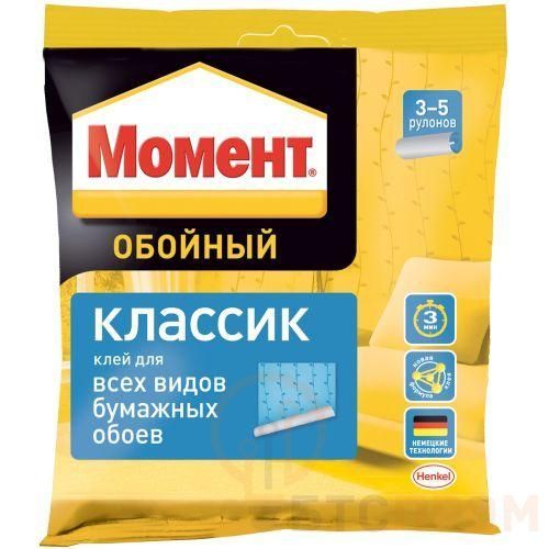 Обойный клей Момент Классик — высококачественный, быстрорастворимый обойный клей на основе модифицированного крахмала. <ul> <li>Возможность коррекции стыков</li> <li>Экономичный расход</li> <li>Остатки клея на обоях легко удаляются слегка влажной тканью</li> <li>Готовый клей можно хранить в закрытой таре до 10 дней</li> </ul>