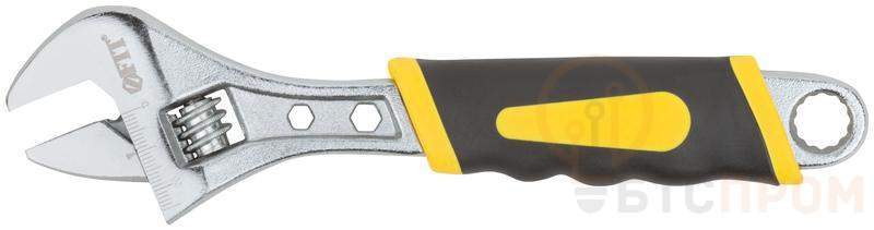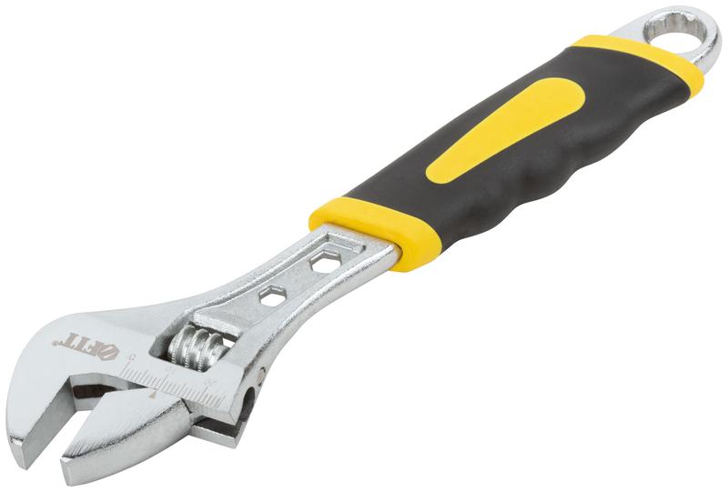 Ключ разводной ‘’Старт’’ FIT IT — универсальный инструмент для сантехнических и слесарных работ, заменяющий целый набор обычных рожковых ключей! Ключ изготовлен из штампованной термообработанной инструментальной стали с хромированным покрытием. Накидной ключ, встроенный в рукоятку, делает данное изделие многофункциональным. Удобная эргономичная рукоятка с ПВХ-накладкой не скользит в руке во время работы. Размерная шкала позволяет точно настроить ключ.
