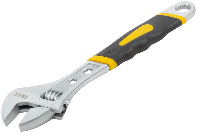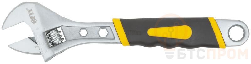 Ключ разводной ‘’Старт’’ FIT IT — универсальный инструмент для сантехнических и слесарных работ, заменяющий целый набор обычных рожковых ключей! Ключ изготовлен из штампованной термообработанной инструментальной стали с хромированным покрытием. Накидной ключ, встроенный в рукоятку, делает данное изделие многофункциональным. Удобная эргономичная рукоятка с ПВХ-накладкой не скользит в руке во время работы. Размерная шкала позволяет точно настроить ключ.